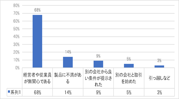 下記に「なぜ顧客は去って行ったのか?」という有名な調査があります。既存客が離れて行った原因の68%は、経営者や従業員がお客様へ無関心(フォロー不足)だからです。従って、既存客と継続的に接触していく方法を実行すればいいのです。その中でも「商品」を媒介にして接触が続く仕組みをつくることが最も効果的といわれています。